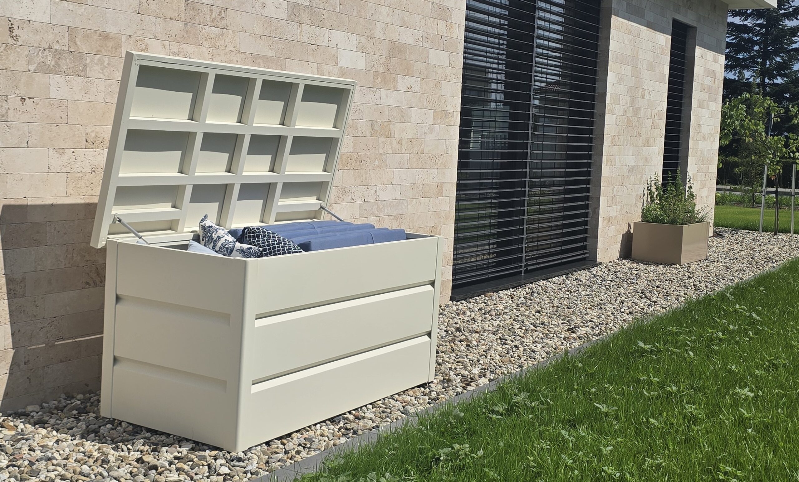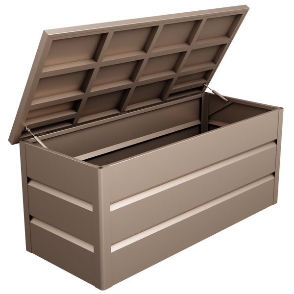 Mit großzügigem Fassungsvermögen bietet die Gartenbox ausreichend Platz für sämtliches Gartenzubehör. Sie sorgt dafür, dass Kissen, Abdeckungen und andere Gartenutensilien über Jahre hinweg sicher und ordentlich aufbewahrt werden. Hergestellt aus hochwertigem, pulverbeschichtetem Aluminium, ist die Box besonders wetterbeständig und langlebig- ideal für den Einsatz im Freien.