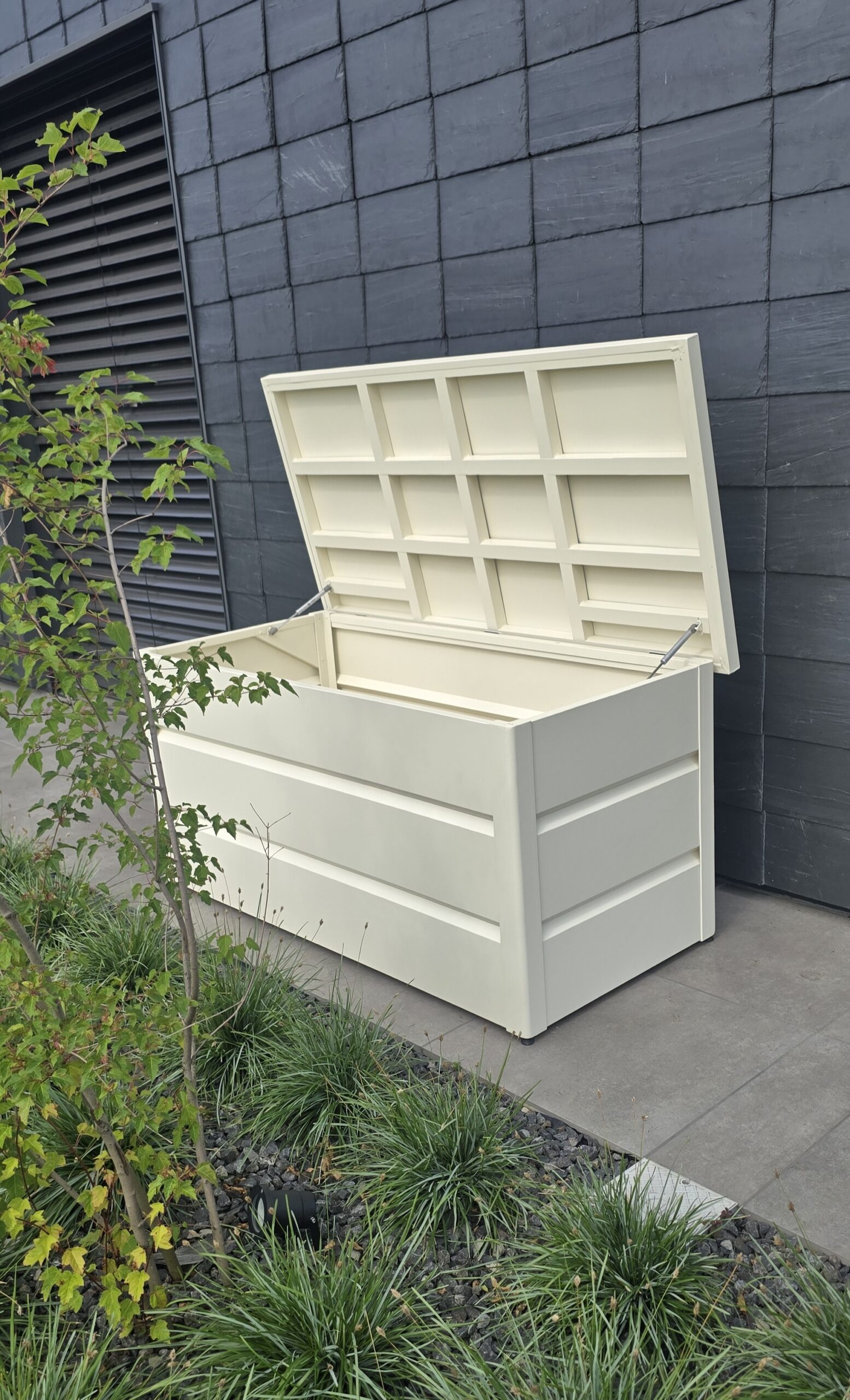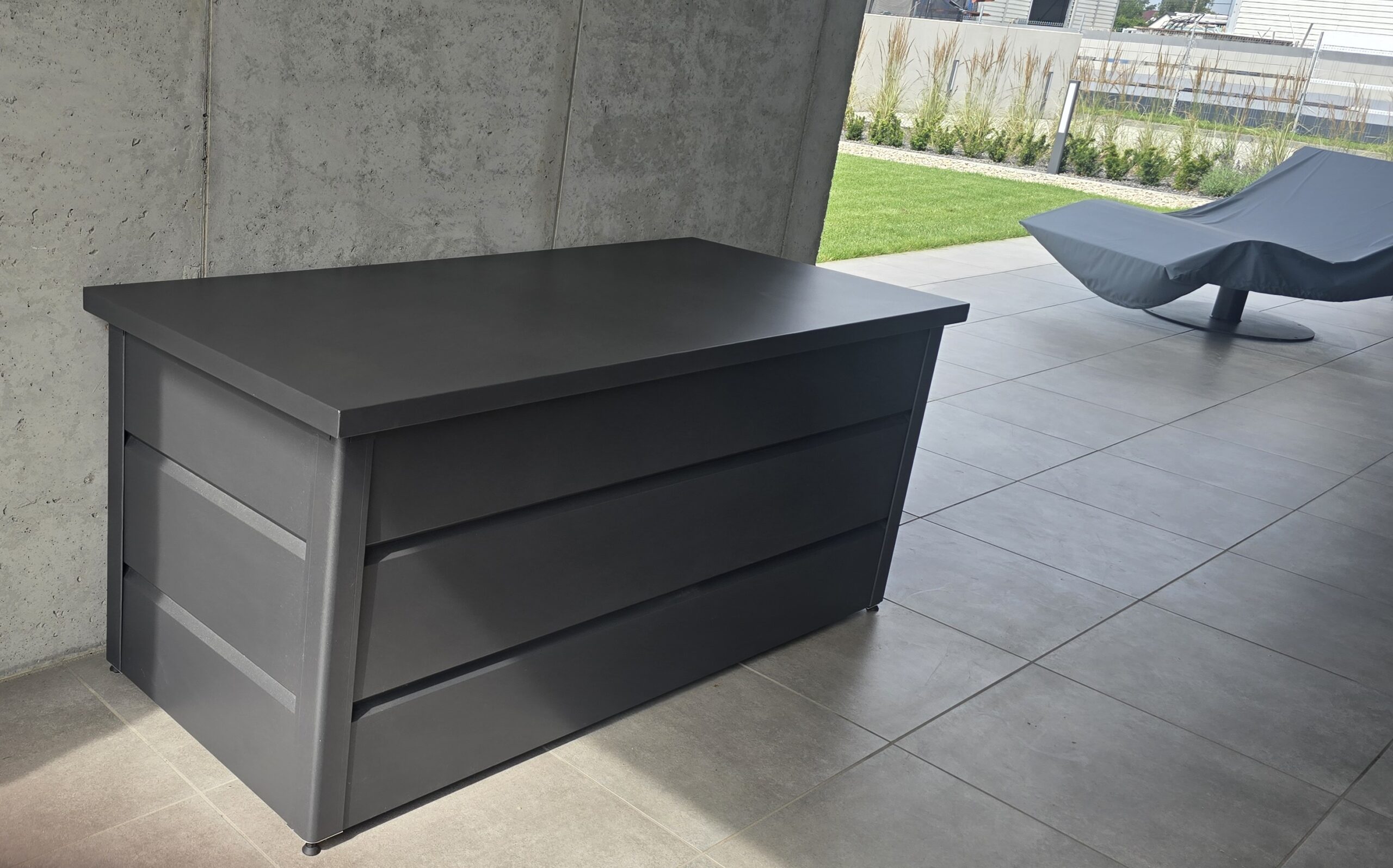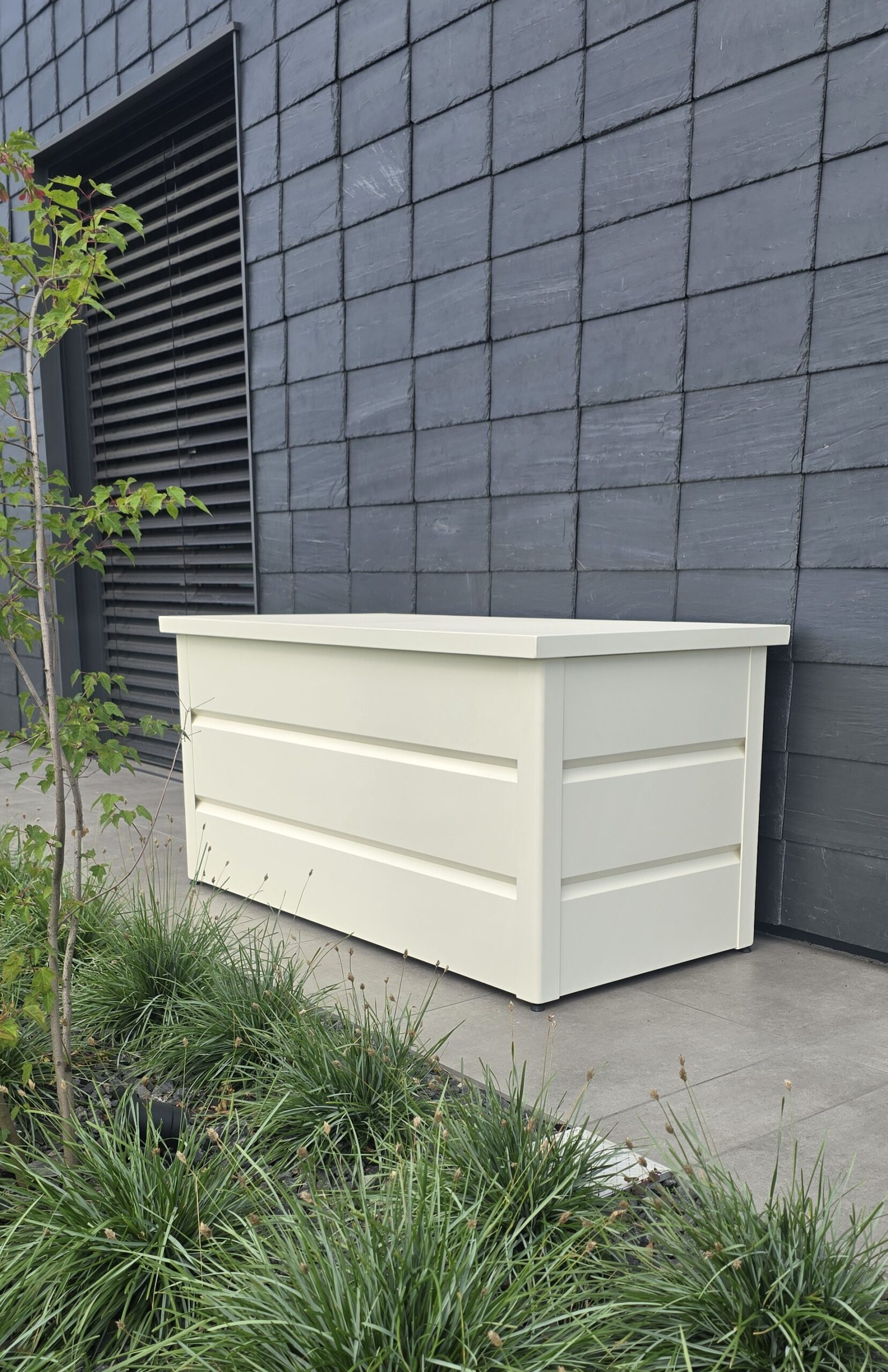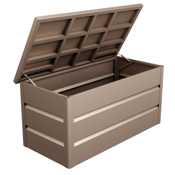 Mit großzügigem Fassungsvermögen bietet die Gartenbox ausreichend Platz für sämtliches Gartenzubehör. Sie sorgt dafür, dass Kissen, Abdeckungen und andere Gartenutensilien über Jahre hinweg sicher und ordentlich aufbewahrt werden. Hergestellt aus hochwertigem, pulverbeschichtetem Aluminium, ist die Box besonders wetterbeständig und langlebig- ideal für den Einsatz im Freien.